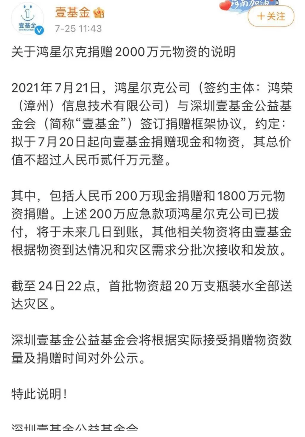 壹基金发布声明称,21日与鸿星尔克签订了2000万捐赠协议,已经收到了200万现金,20万瓶矿泉水已经送到了灾区,还剩下1800万物资也在发放的路上。