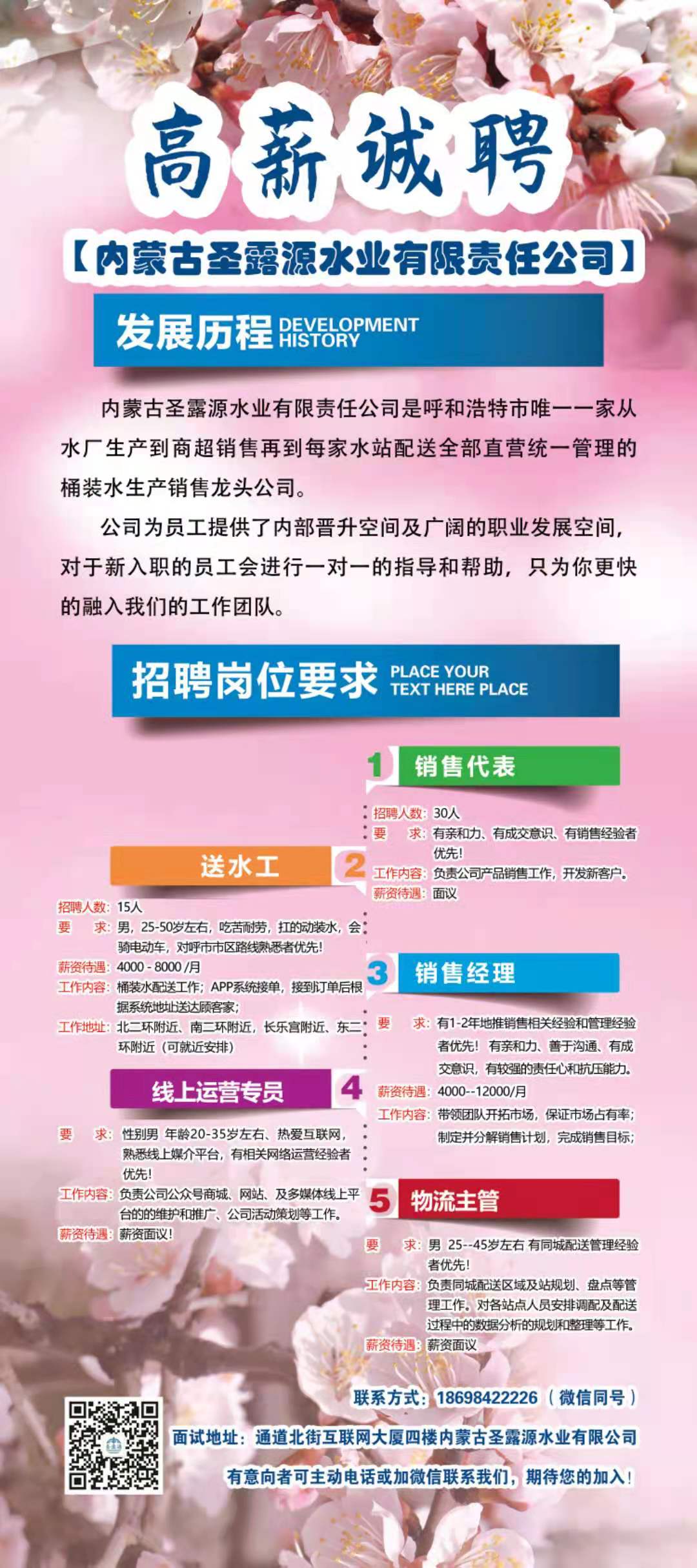 面试地址:回民区通道北街互联网大厦四楼内蒙古圣露源水业有限责任公司