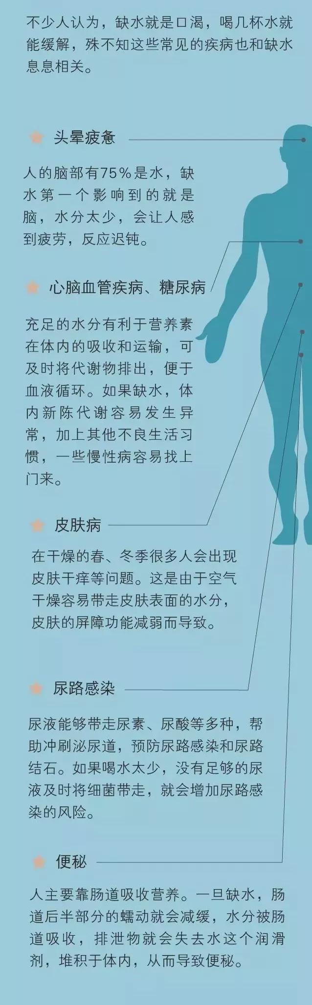 其实有许多的疾病与我们的身体缺水有关,身体缺水造成了水代谢功能紊乱,生理紊乱又导致了诸多疾病的产生。特别是哮喘症、过敏症、胃灼热、高血压、腰痛、糖尿病甚至癌症等疾病,通过喝好水都能得到最好的预防。
